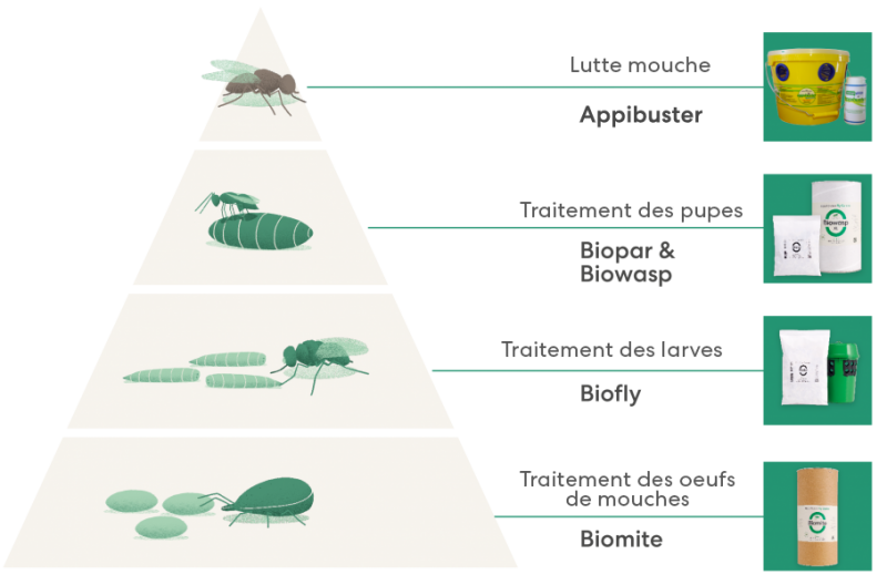 - BIOFLY : prédateur des asticots, il limite leur croissance avant la transformation en pupes.